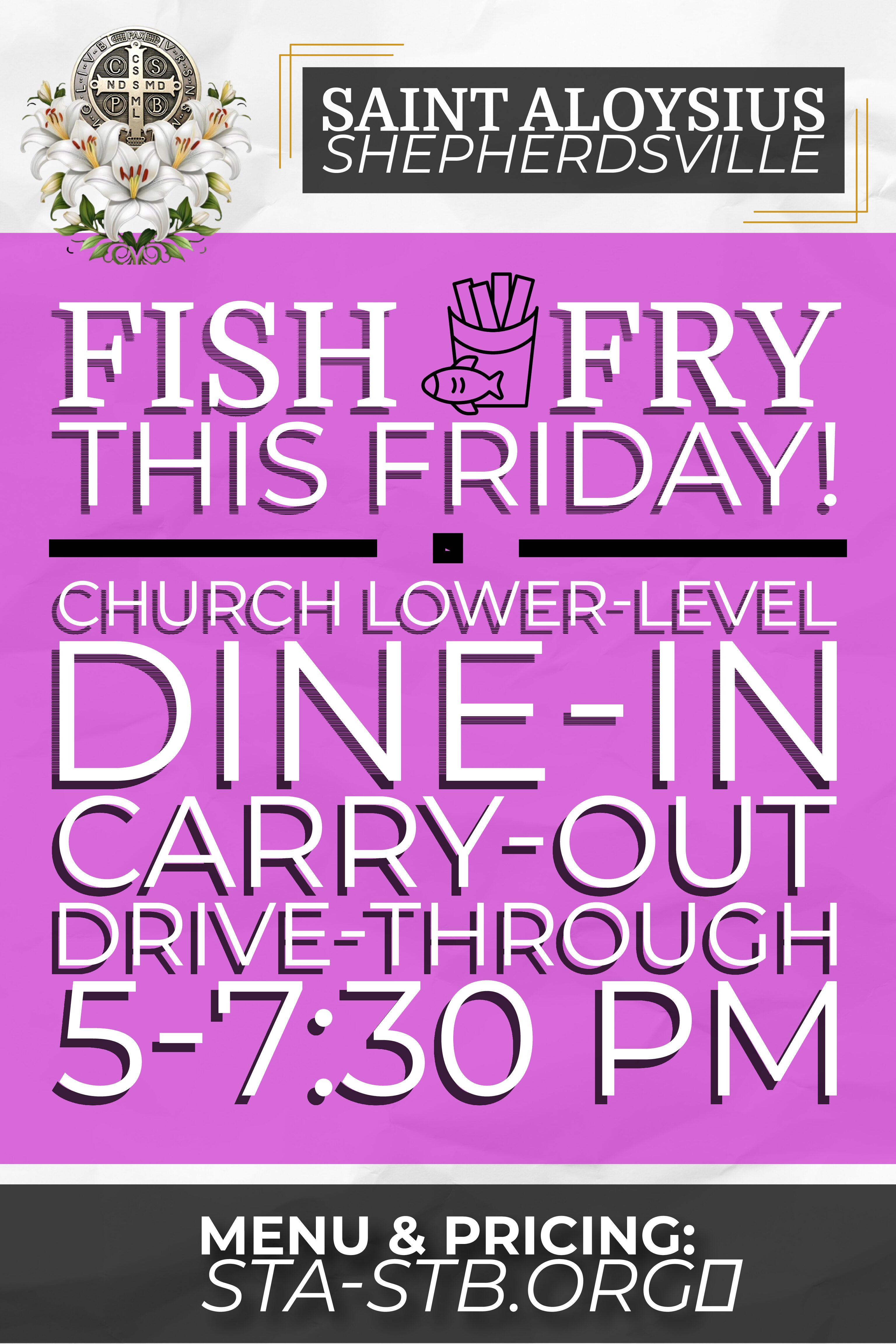 Join us for St. Aloysius Lenten Fish Fry’s, Shepherdsville, KY Fridays- Feb 13 thru March 27, 2026 from 5pm to 7:30 pm Dine in-Carry Out- Drive Thru Cash and Credit…